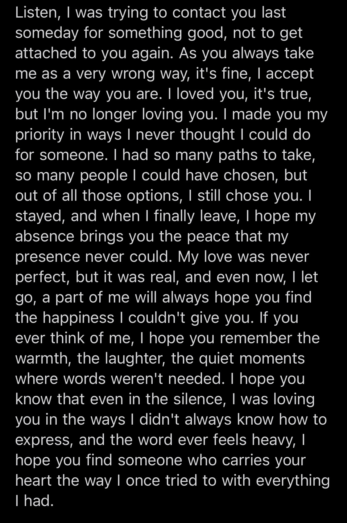 There is a quiet, devastating grace in realizing that your absence might finally bring the peace that your presence never could. It is the ultimate paradox of devotion: loving someone enough to become a ghost in their story. I am unlearning the rhythm of a heart I once tried to carry with everything I had, settling instead into the heavy silence where words are no longer needed. This is not a departure born of regret or the sudden cooling of affection; it is the acceptance of a love that was real, imperfect, and eventually, finished. I leave behind the warmth, the laughter, and the quiet moments, thankful for the way I was loved and the way I was allowed to love in return. We are now two separate entities navigating the spaces where we used to overlap.